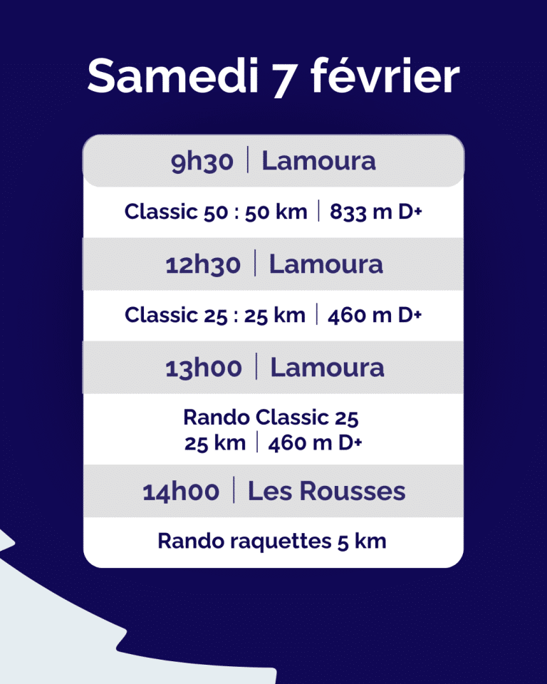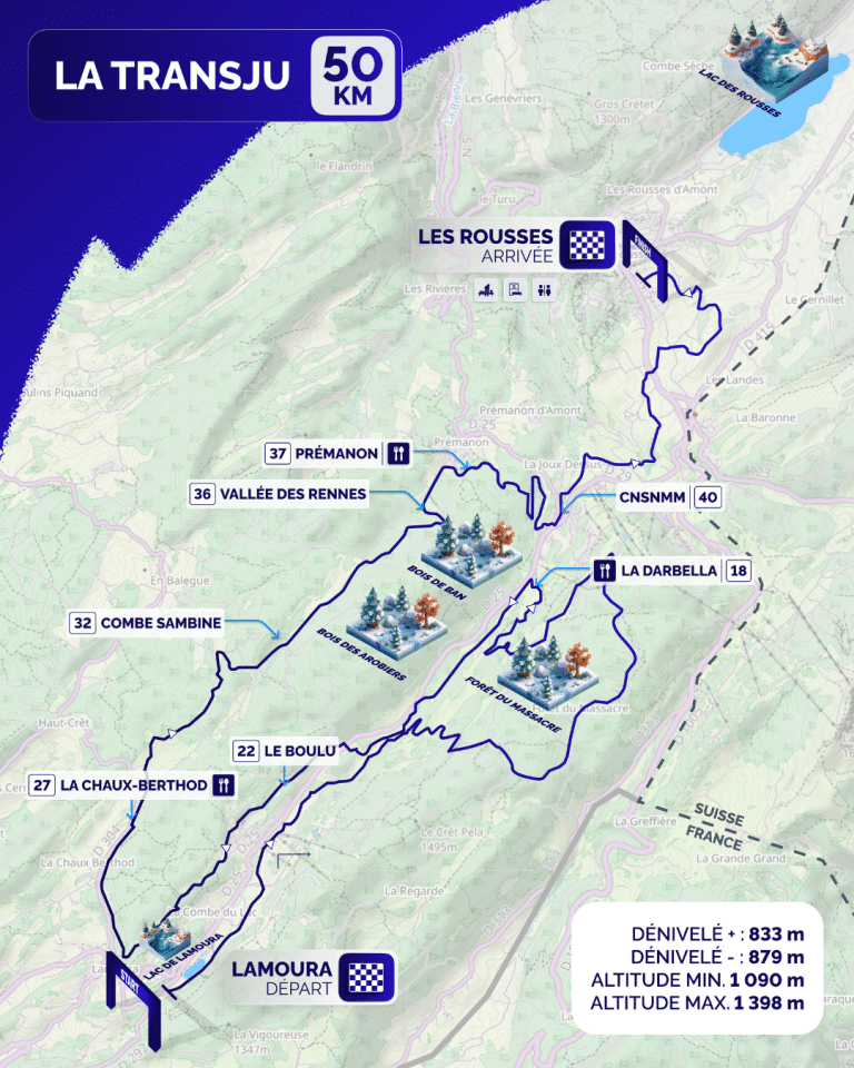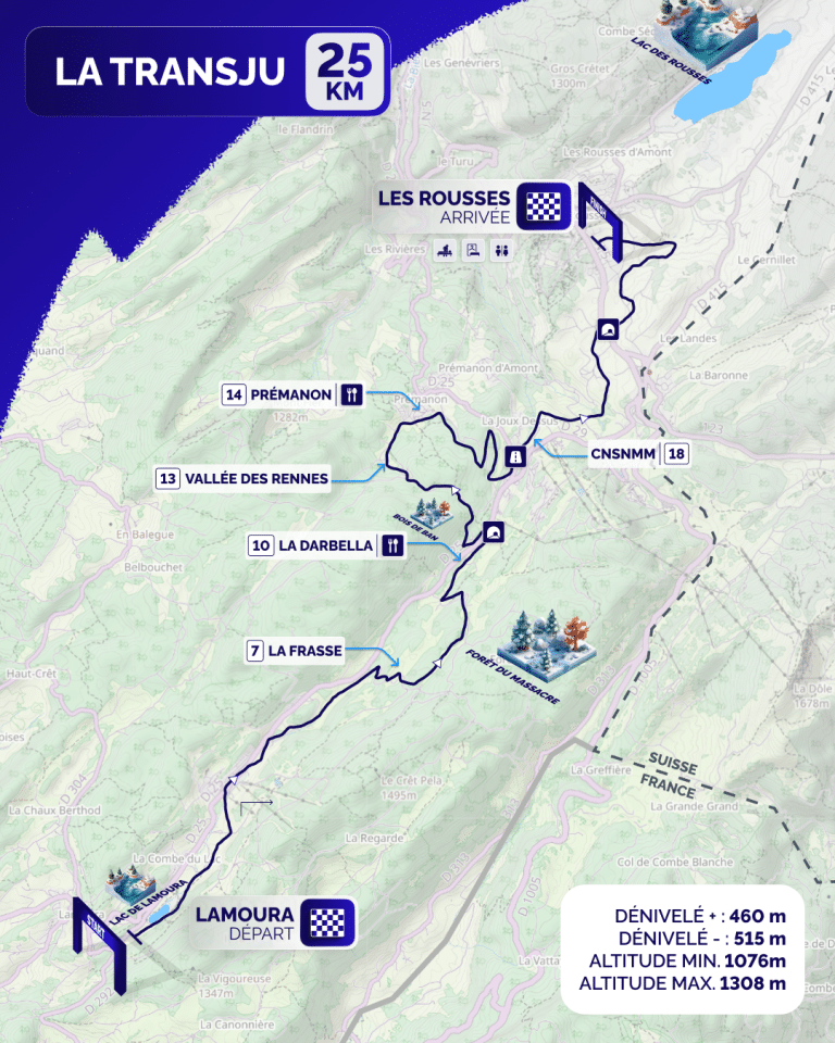 Grâce à un bon enneigement et au travail des équipes terrain les différents massifs, La Transju’ 2026 aura lieu entre Lamoura et Les Rousses, avec un parcours linéaire allant de 50 à 56 km. Ce parcours avait déjà été proposé pour l’édition 2023. Des précipitations sont annoncées tout au long de la semaine avec des chutes de neige mêlées à de la pluie. Cette situation ne nous permet malheureusement pas de proposer le parcours originel de La Transjurassienne de 70 km.