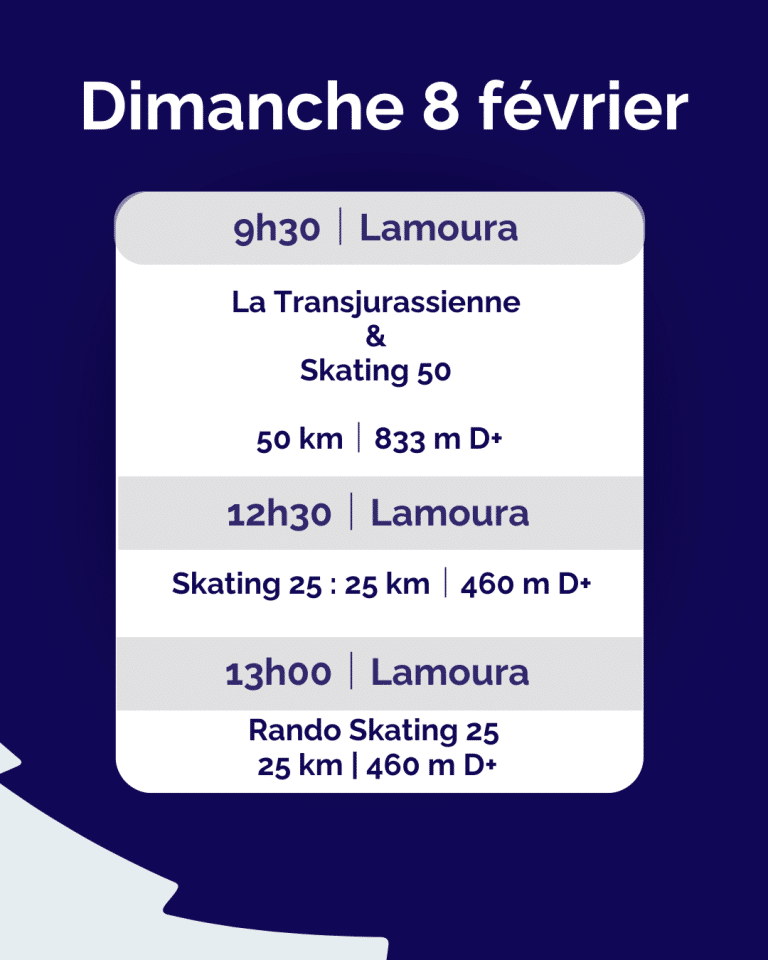 – Dimanche : les épreuves de La Transjurassienne et la Skating 50 km sont fusionnées et forment une seule et même course de 50-56 km, avec un classement unique : La Transjurassienne 50 km.